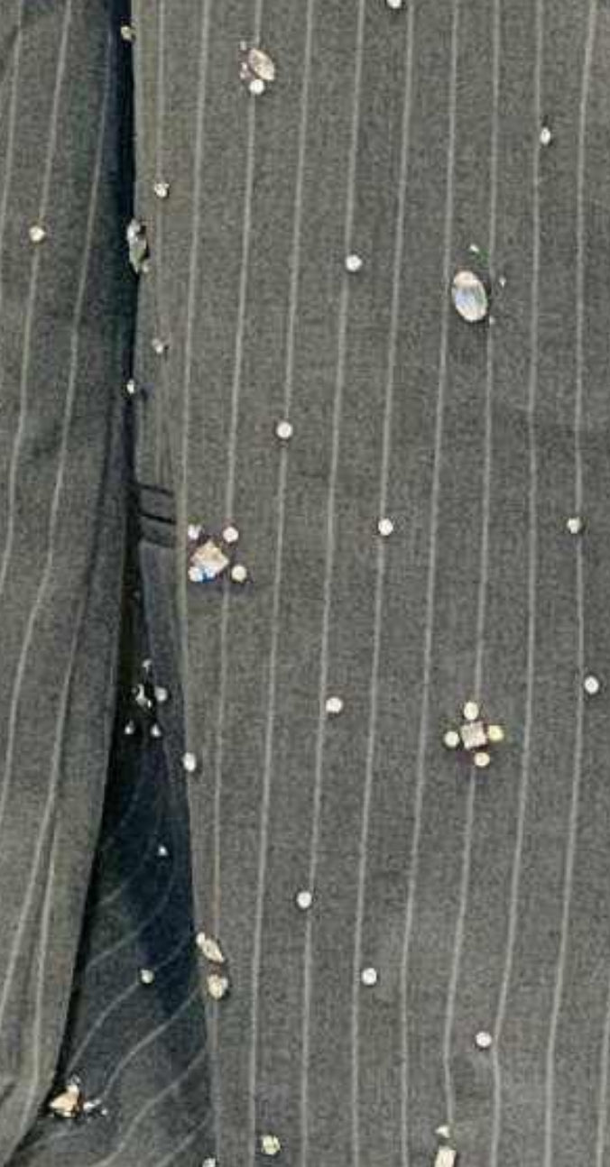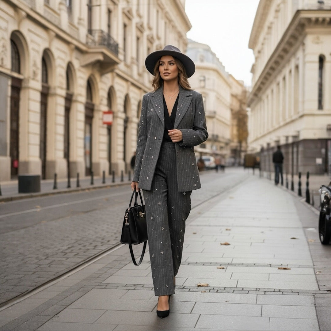 Un compleu rafinat, realizat din stofă premium gri cu dungi fine verticale, decorat cu aplicații bijuterie discrete pentru o notă subtilă de strălucire. Sacoul este complet căptușit, oferind confort și o așezare impecabilă pe corp, iar pantalonii au croi drept, ușor lejer, ce alungește silueta.Perfect pentru birou, evenimente, dar și apariții urbane cu un aer parizian chic.