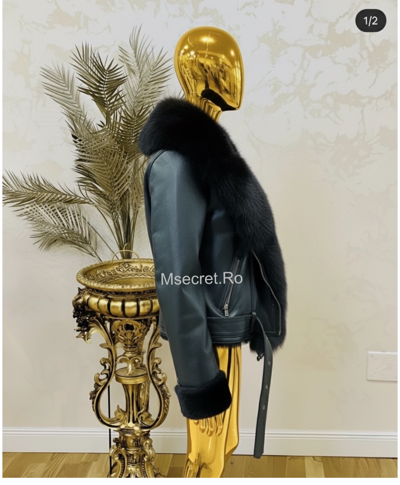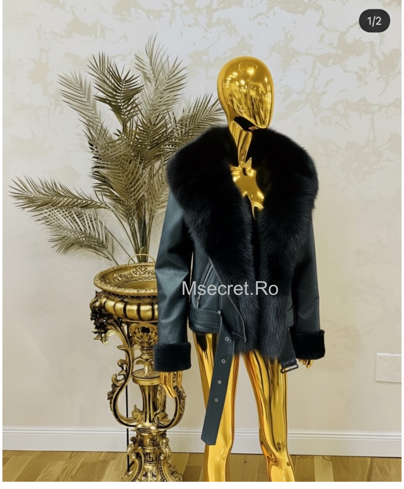 Geaca tip cojoc eleganta cu blana naturala de vulpe neagra la guler si mansete. Un model rafinat si modern, ideal pentru sezonul rece. Croiala feminina cu centura in talie ofera o silueta impecabila si un look sofisticat. O alegere de lux pentru tinute stylish si calduroase.