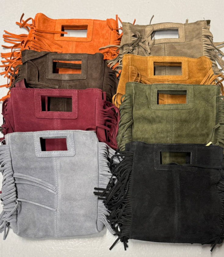 Geanta din piele intoarsa naturala de inalta calitate, cu un design rafinat si franjutil. Realizata cu atentie la finisaje, este o piesa durabila si eleganta, potrivita atat pentru tinutele de zi, cat si pentru cele de seara. Disponibila in mai multe nuante sofisticate, aceasta geanta imbina stilul modern cu functionalitatea, devenind accesoriul ideal pentru garderoba ta.