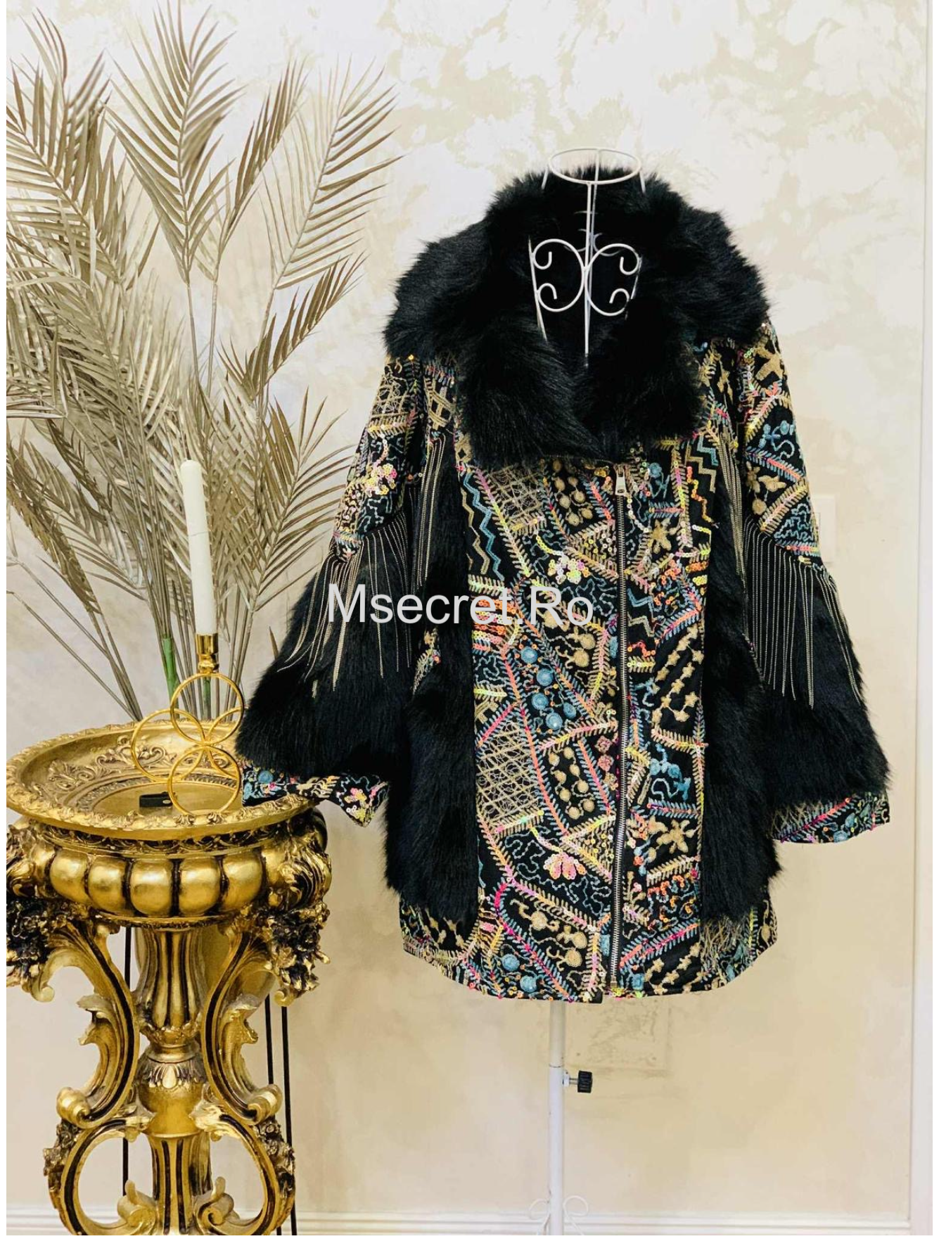 ✨ Design unic – jachetă bogat decorată cu broderie multicoloră, modele geometrice și inserții artistice care creează un efect vizual impresionant.