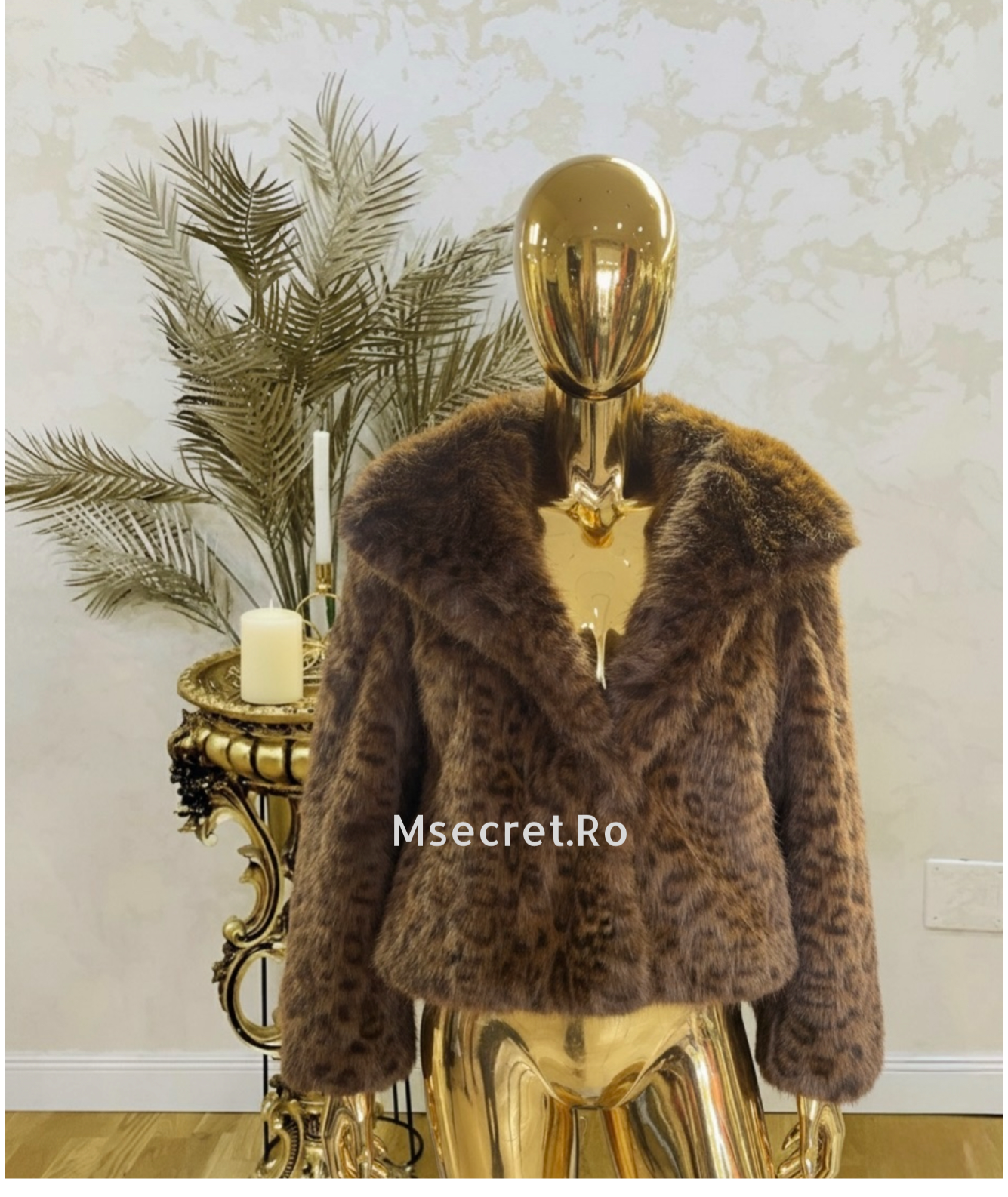Geaca lunga animal print cu gluga, guler de blana naturala
