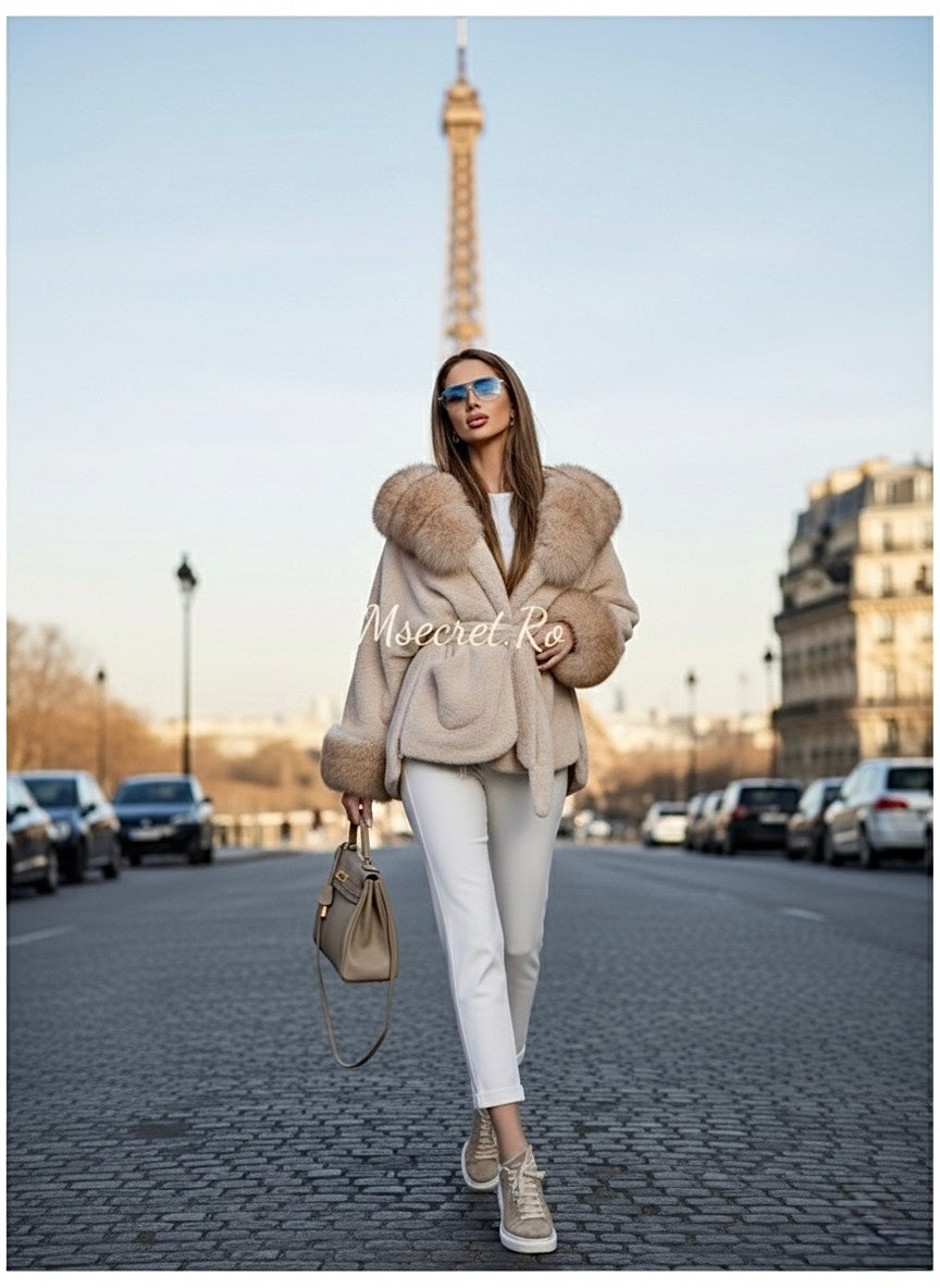 - ❄️ Glugă și manșete îmblănite cu blană naturală de vulpe – aspect luxos și călduros.