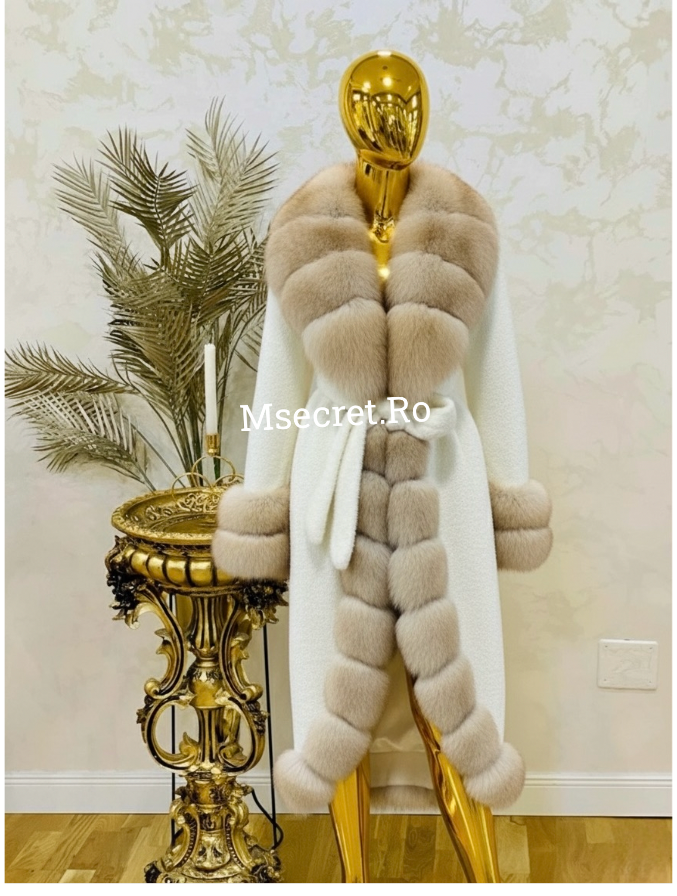 - Detalii luxoase – maneci si guler bogat din blana, finisaje atent lucrate.