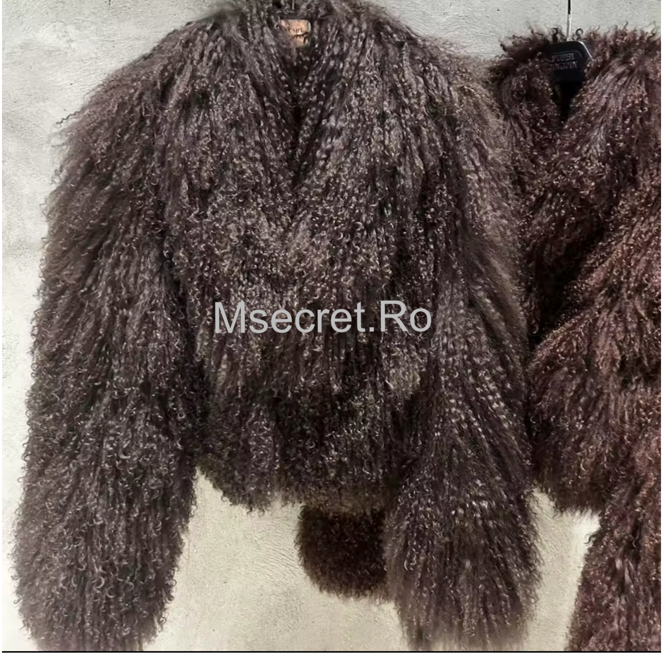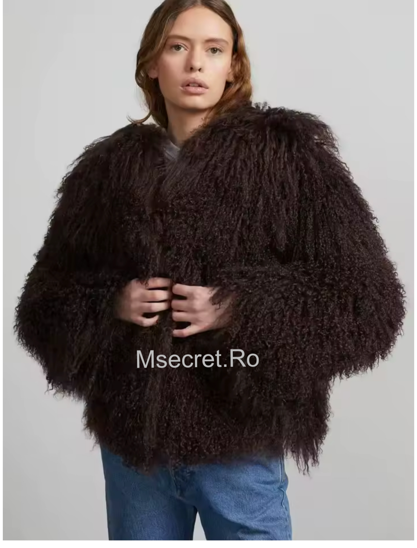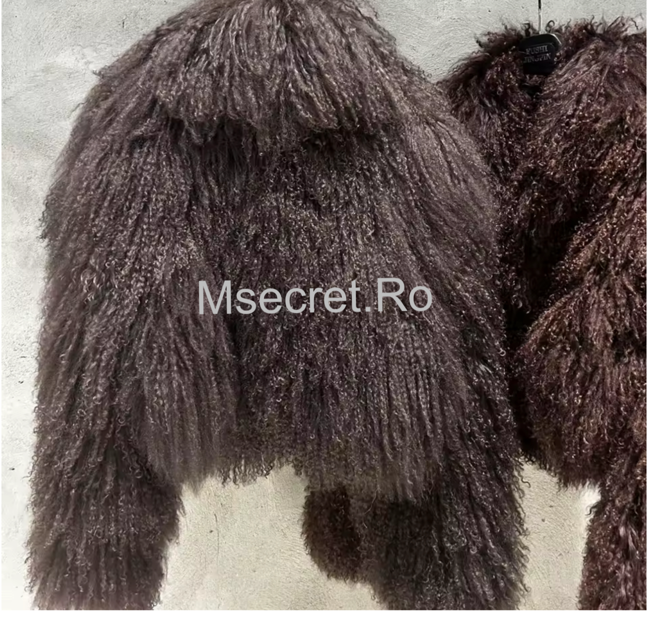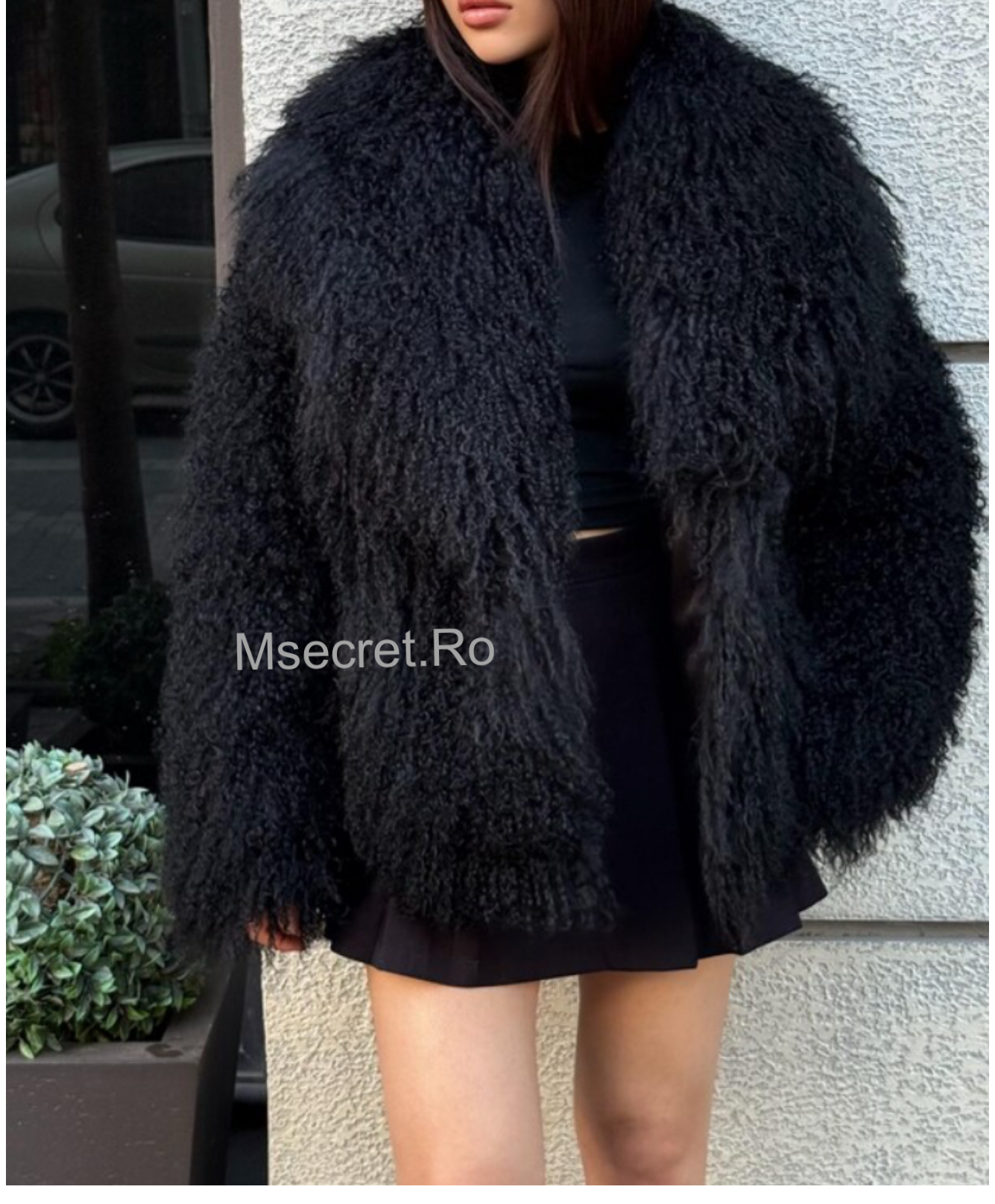 • Material: Blană mongoleza naturală, cunoscută pentru textura sa unică, moale și ondulată.