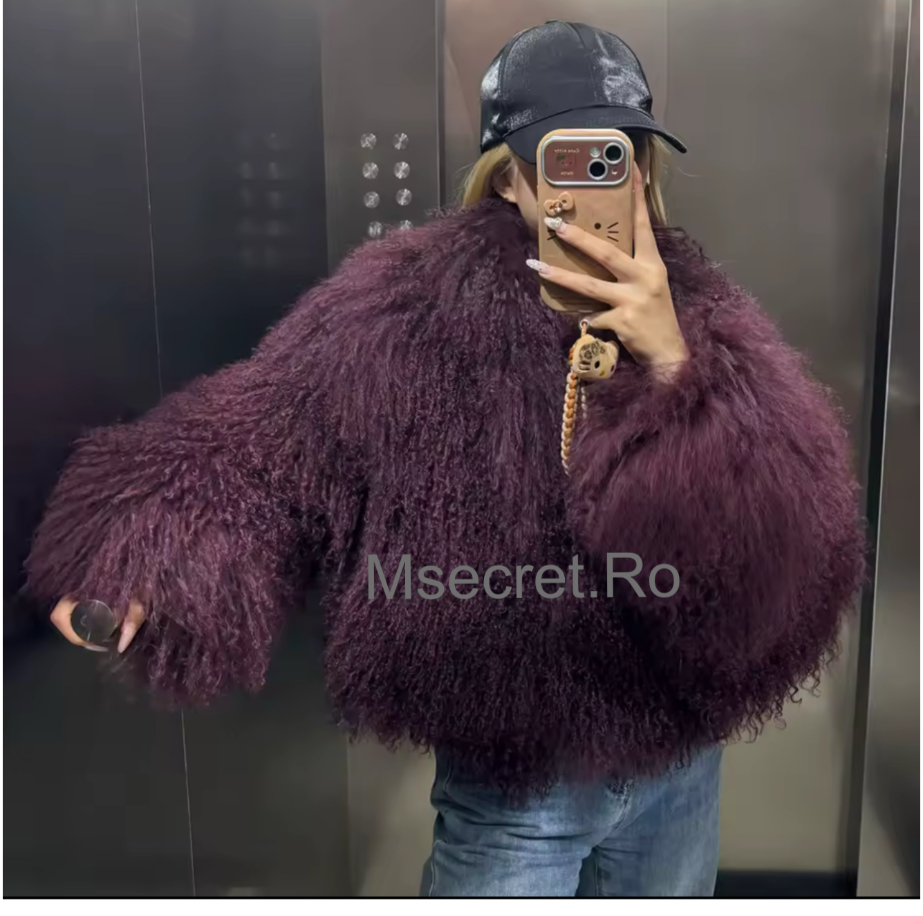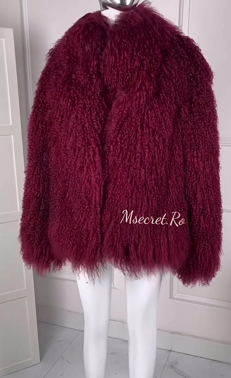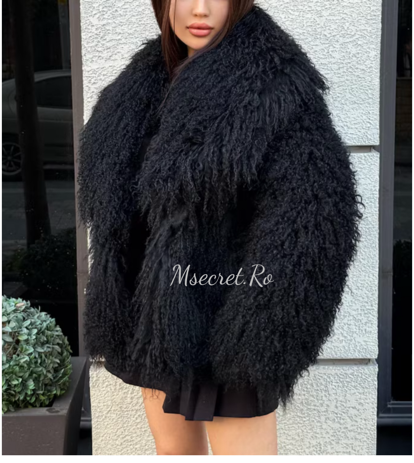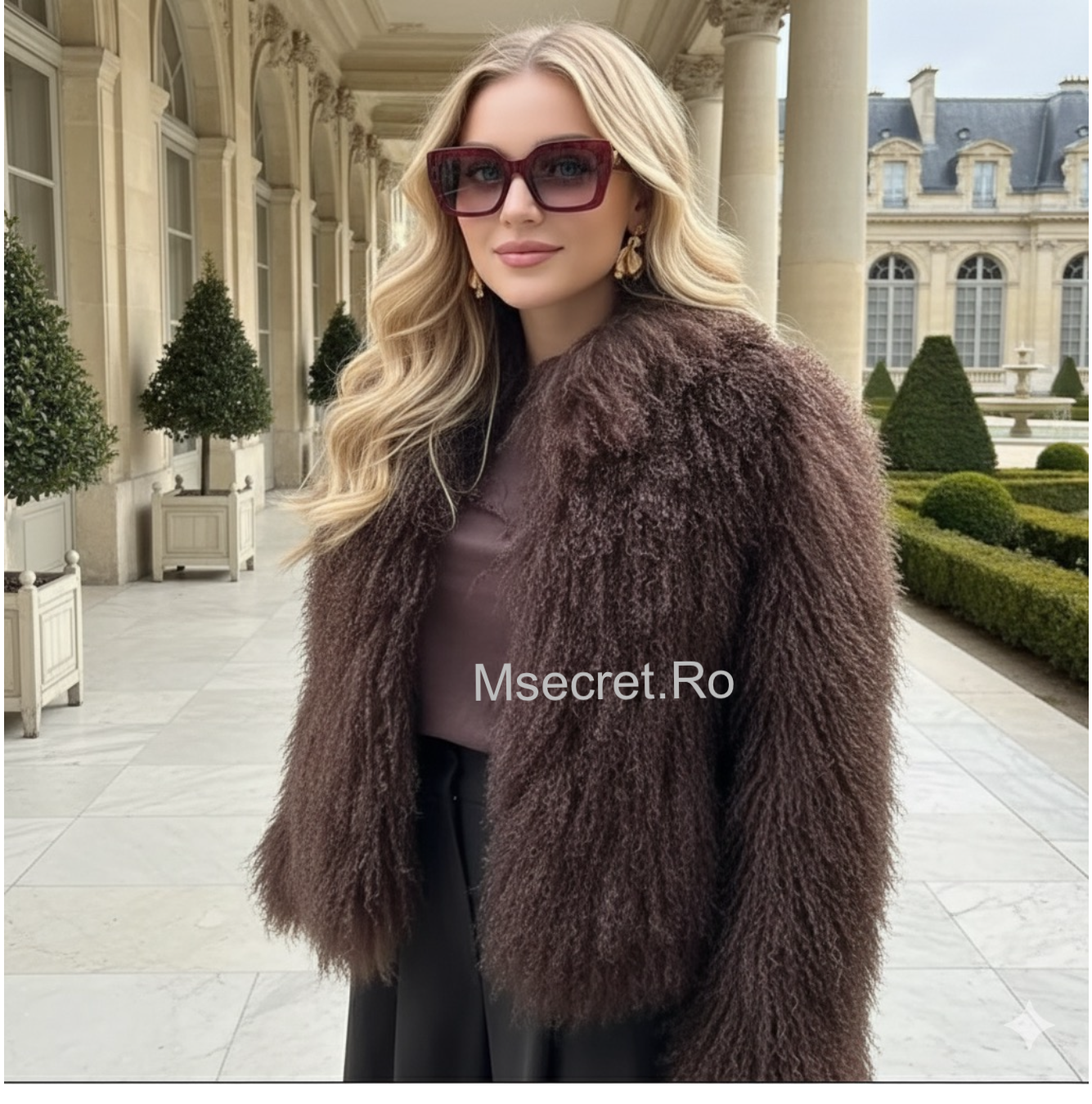 • Material: Blană mongoleza naturală, cunoscută pentru textura sa unică, moale și ondulată.