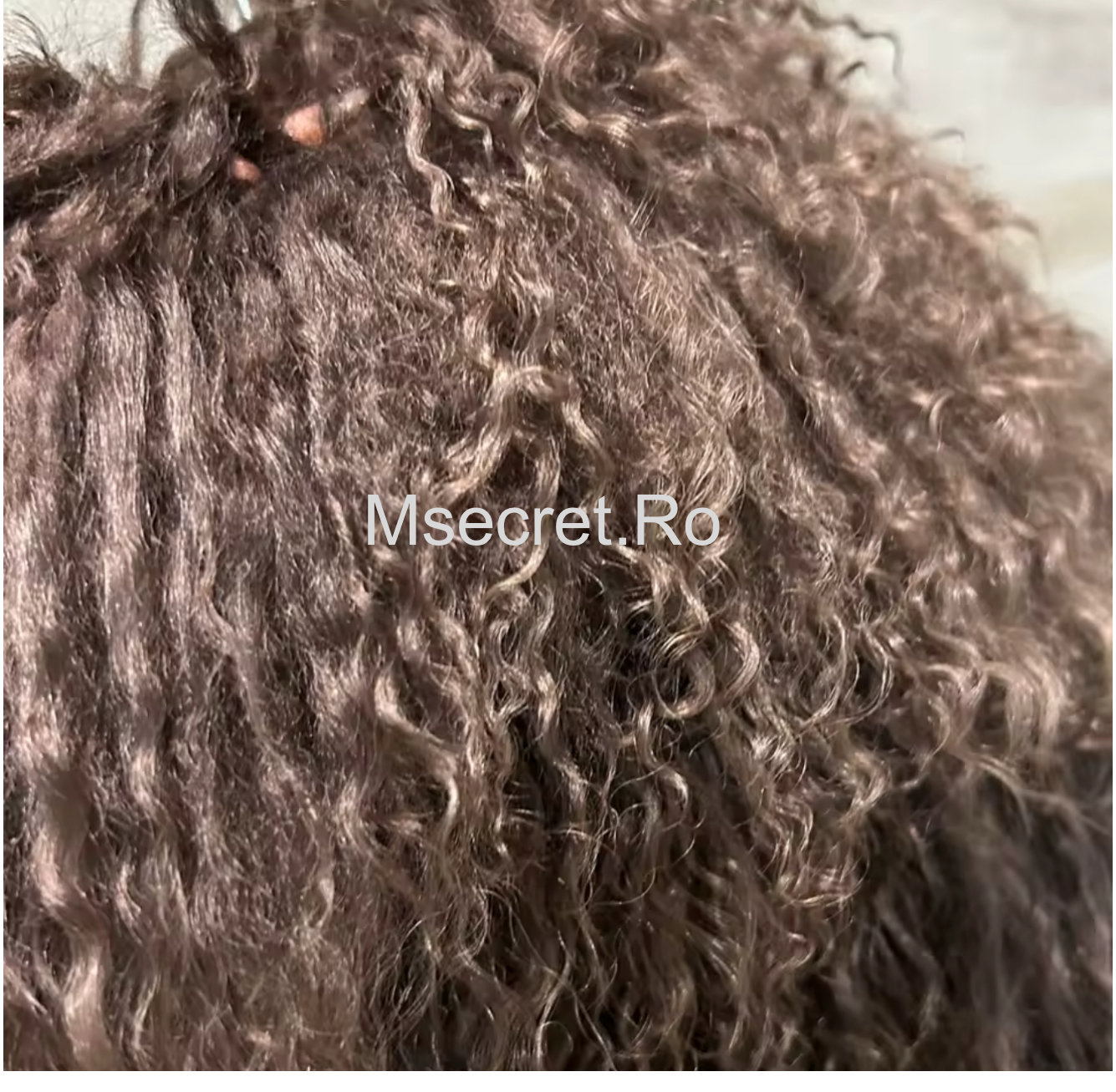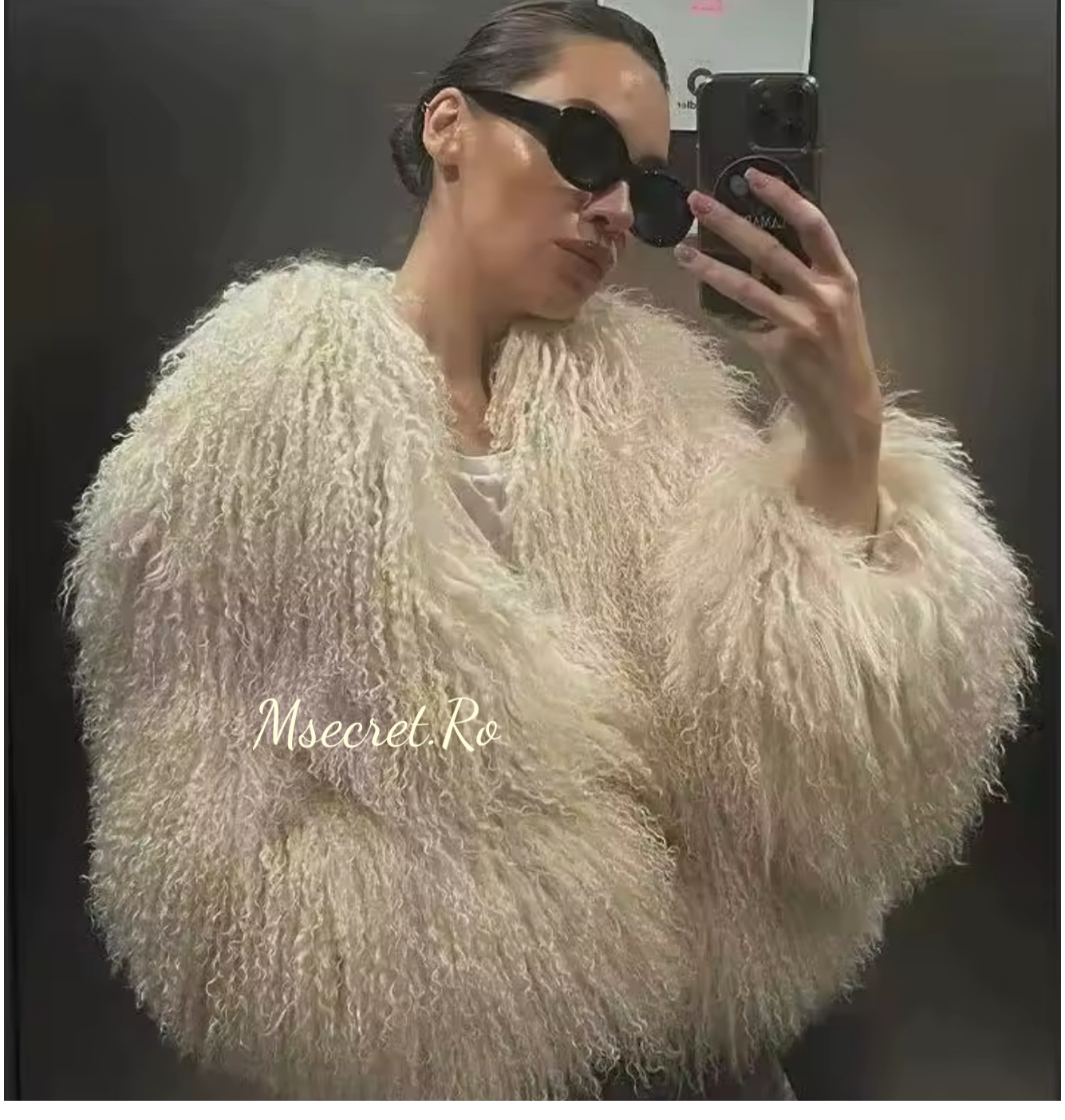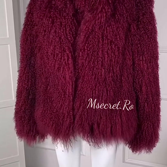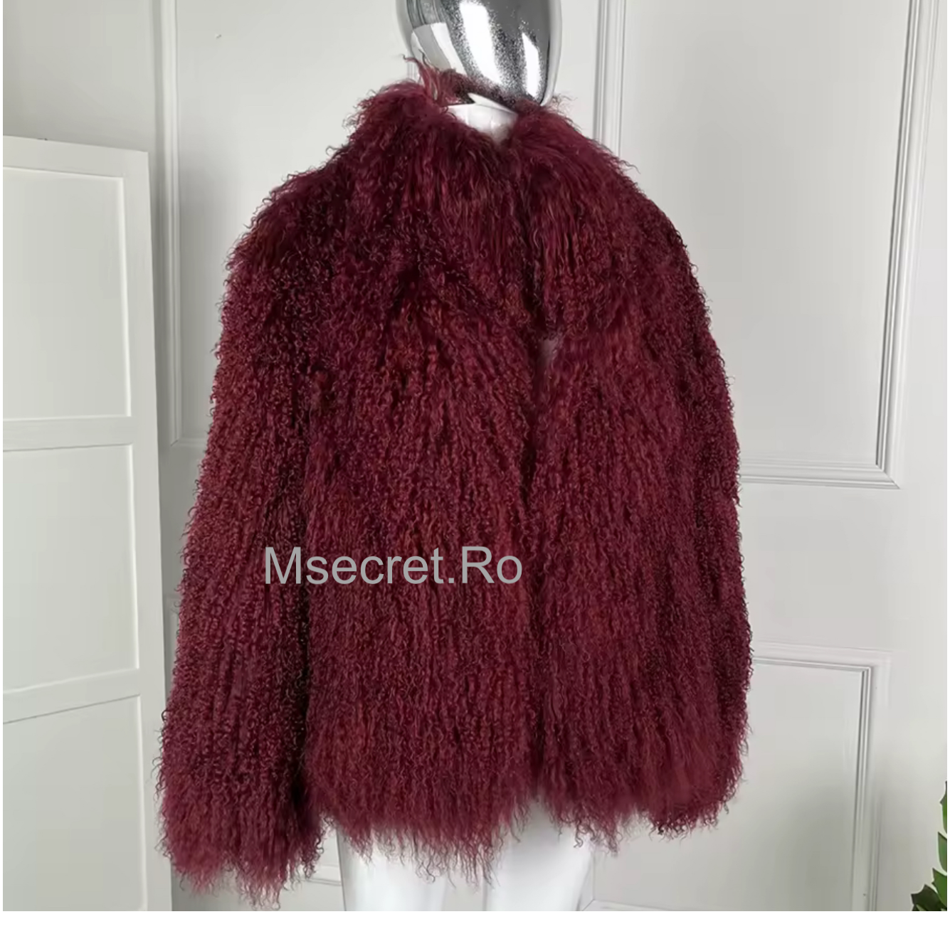 • Material: Blană mongoleza naturală, cunoscută pentru textura sa unică, moale și ondulată.
