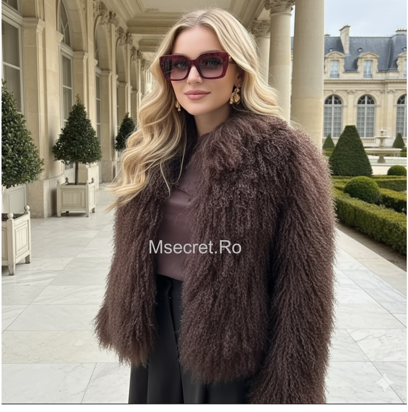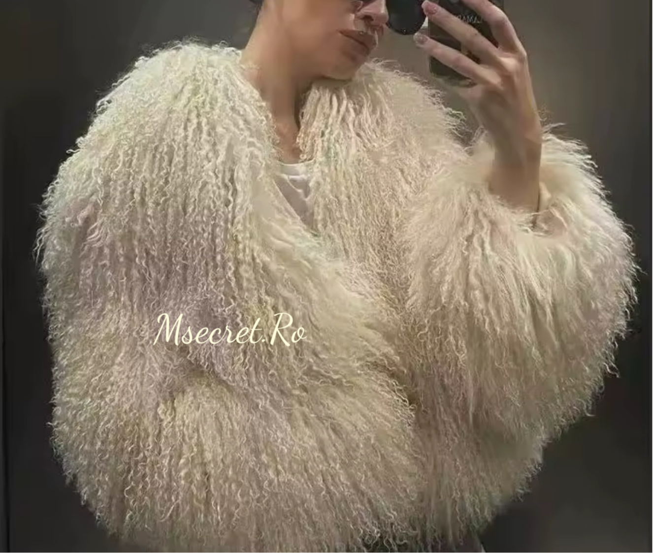 Această haină din blană mongoliană albă este definiția luxului rafinat și a eleganței clasice. Realizată din blană naturală cu un aspect ondulat distinctiv, piesa impresionează prin textura moale și aspectul voluminos, care oferă atât căldură, cât și un aer sofisticat. Designul său este modern, dar păstrează un farmec atemporal, ceea ce o face perfectă pentru femeile care doresc să adauge o notă de rafinament garderobei lor.Haina este croită cu un guler înalt care adaugă protecție împotriva frigului și completează aspectul luxos. Lungimea sa ajustată asigură un echilibru perfect între funcționalitate și estetică, fiind potrivită atât pentru evenimente formale, cât și pentru ocazii speciale sau o ieșire elegantă în oraș.