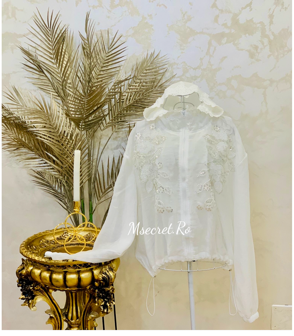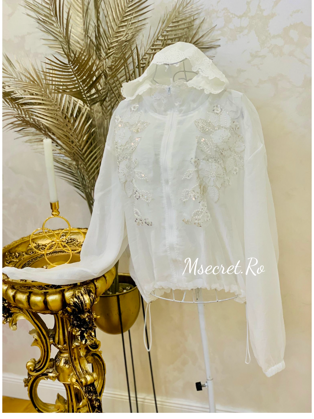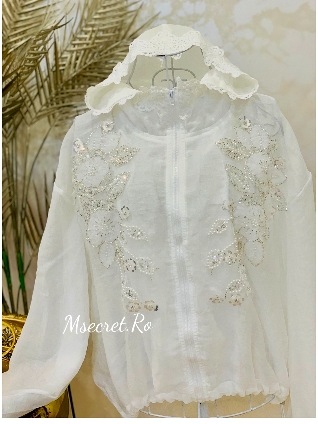 Un design delicat, cu flori brodate manual, perle și paiete discrete. Confecționată din material vaporos, cu glugă romantică din dantelă și închidere cu fermoar.