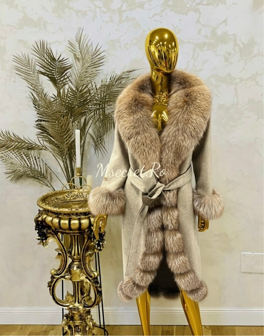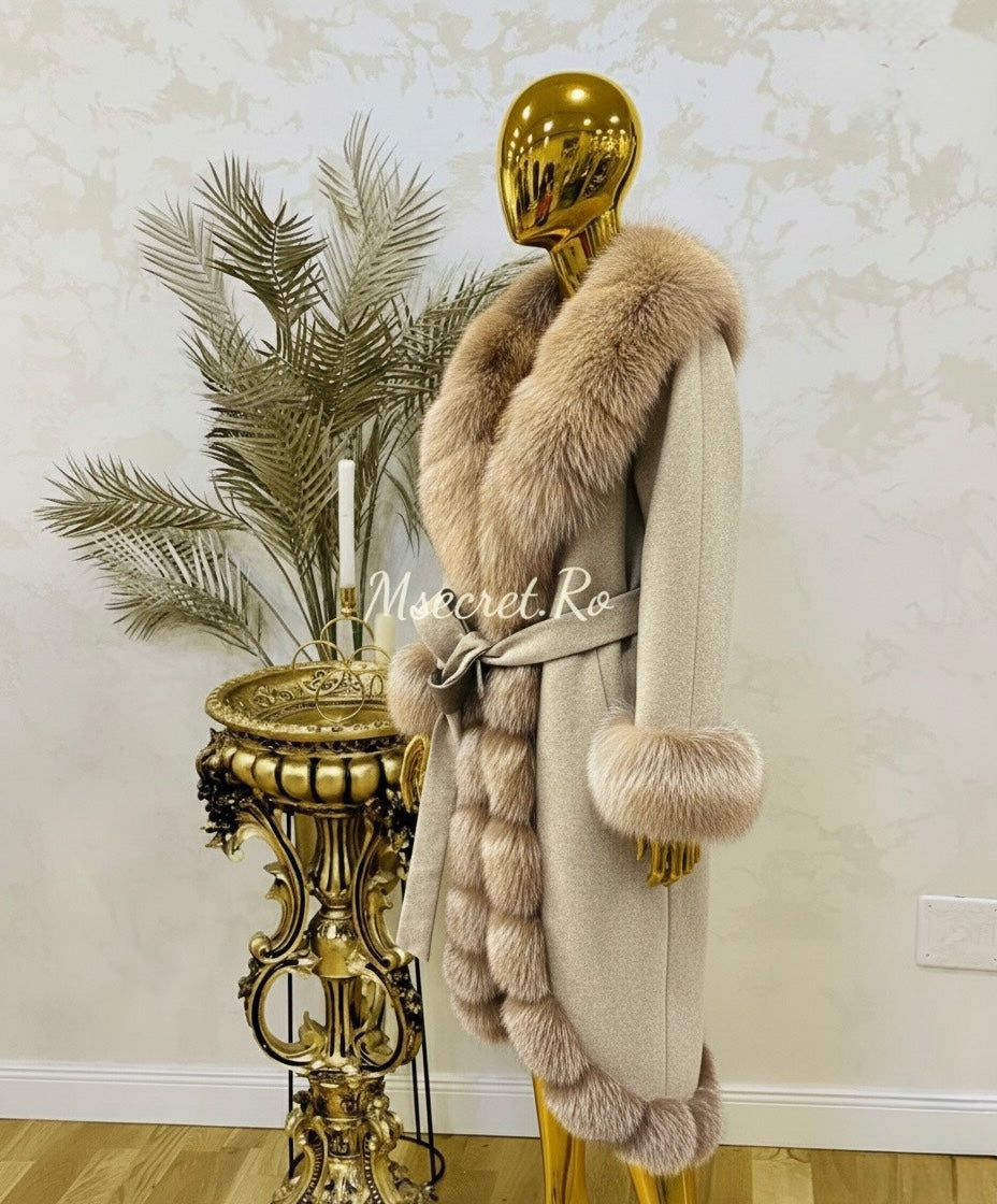Acest palton din alpaca este o piesă de lux, ce îmbină perfect confortul cu eleganța. Spre deosebire de paltoanele din stofă obișnuită, acest model este realizat din fibre de alpaca de calitate superioară, oferind un aspect sofisticat și o senzație plăcută la purtare. Cordonul în talie permite ajustarea și subliniază silueta, oferind o notă feminină. Gulerul voluminos din blană naturală de vulpe adaugă un aer regal și o căldură suplimentară, fiind un detaliu statement care transformă paltonul într-o piesă unică. Buzunarele spațioase sunt ideale pentru a-ți ține mâinile la căldură sau pentru a păstra obiectele de care ai nevoie. Acest palton este perfect pentru femeile care caută o alternativă premium la paltoanele tradiționale, aducând un plus de stil și rafinament oricărei ținute de iarnă!