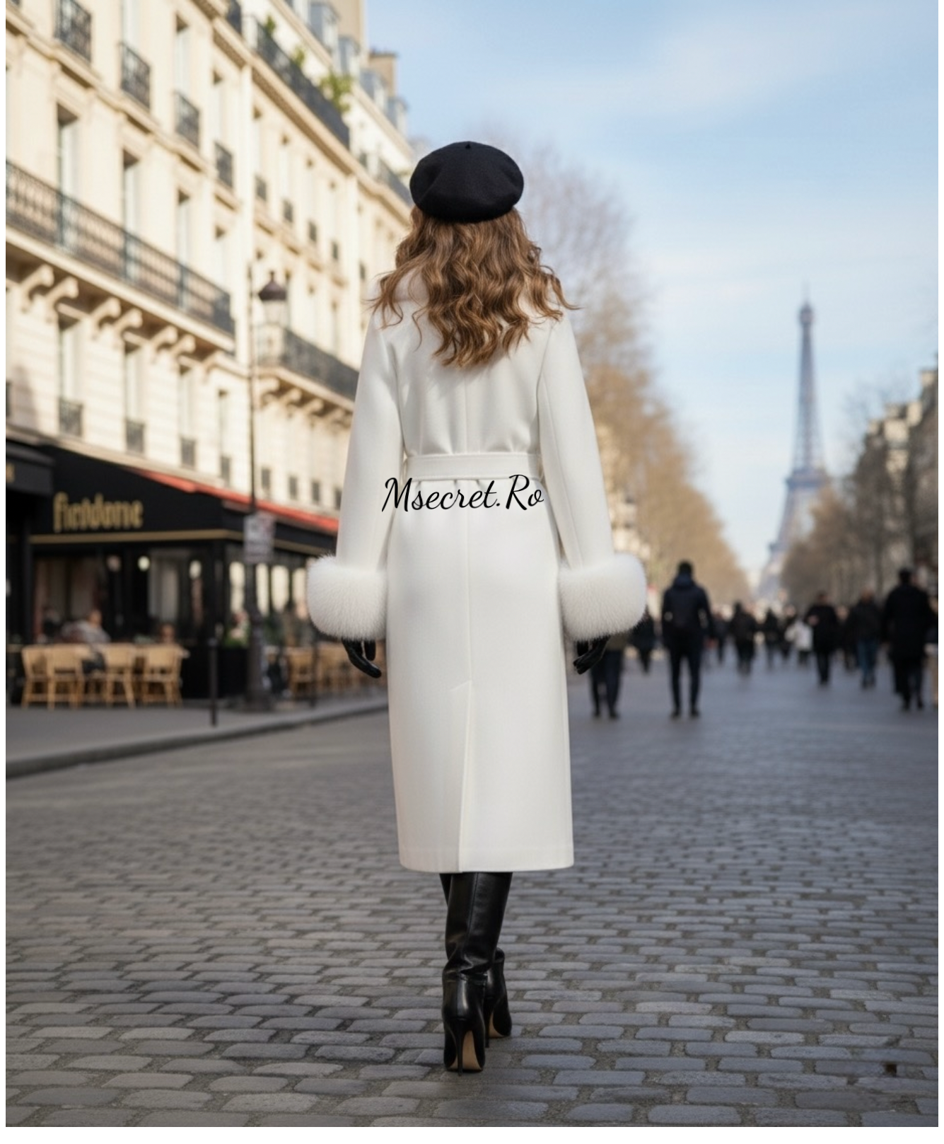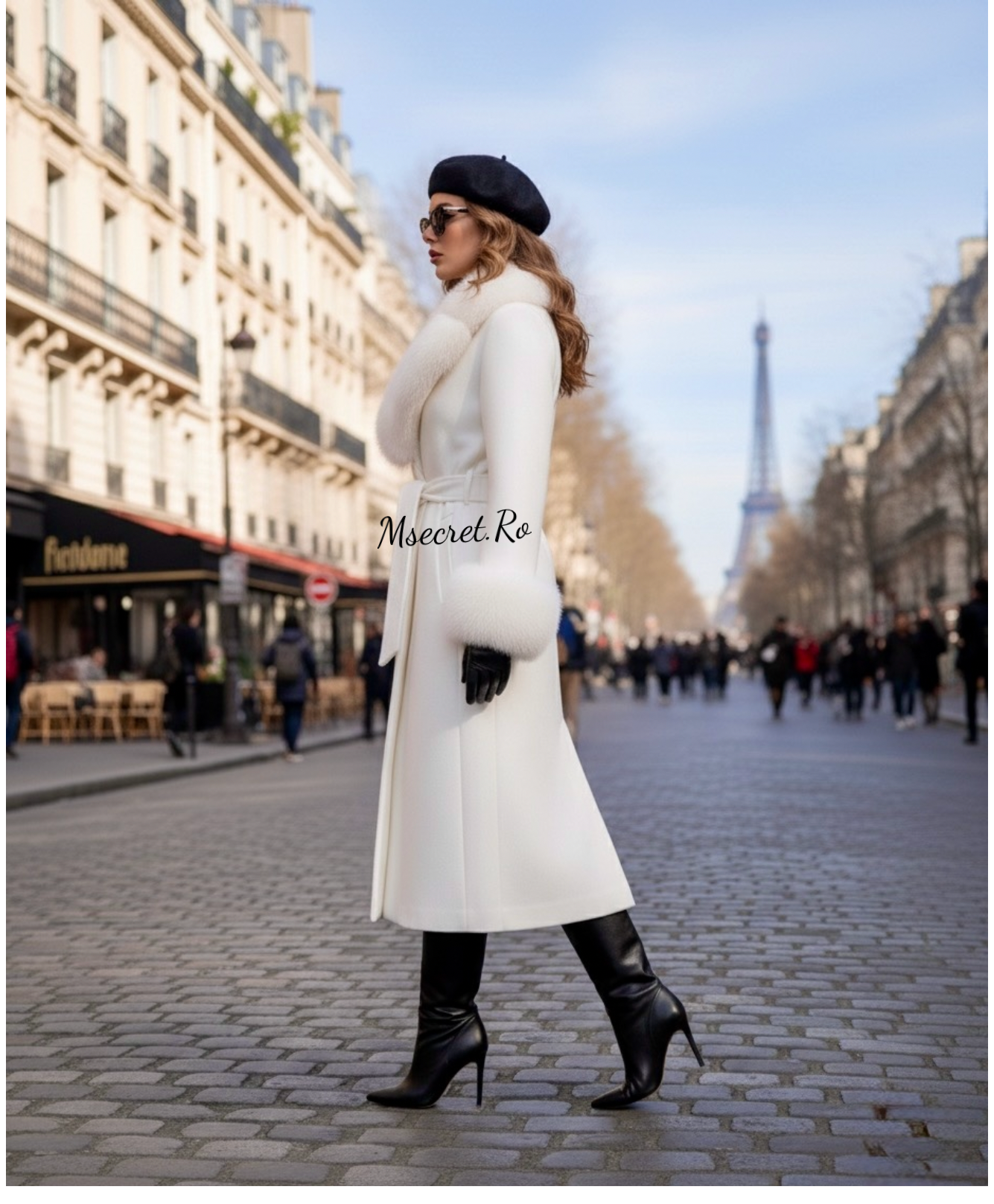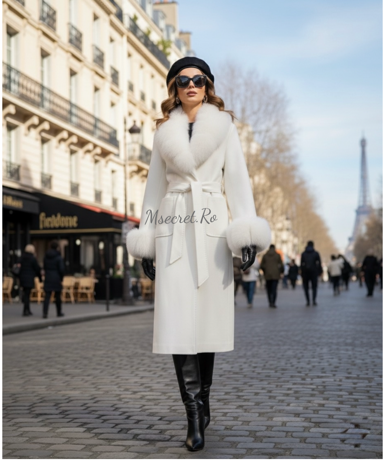 - Blana naturala de vulpe la guler si mansete – ofera volum, rafinament si o nota luxoasa.