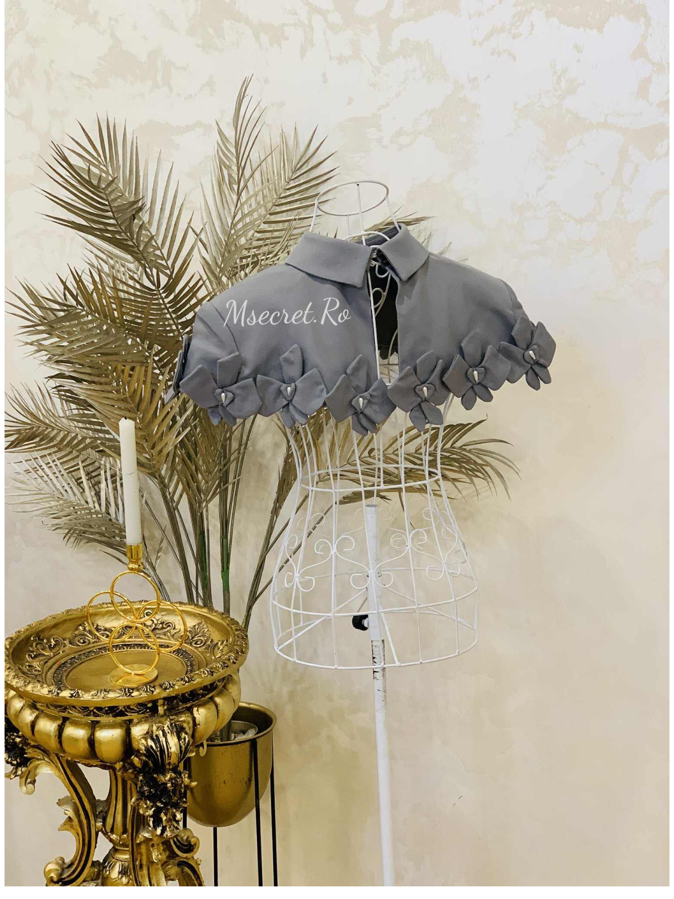 • guler gri clasic, cu capelet decorativ detașabil, cu funde aplicate;