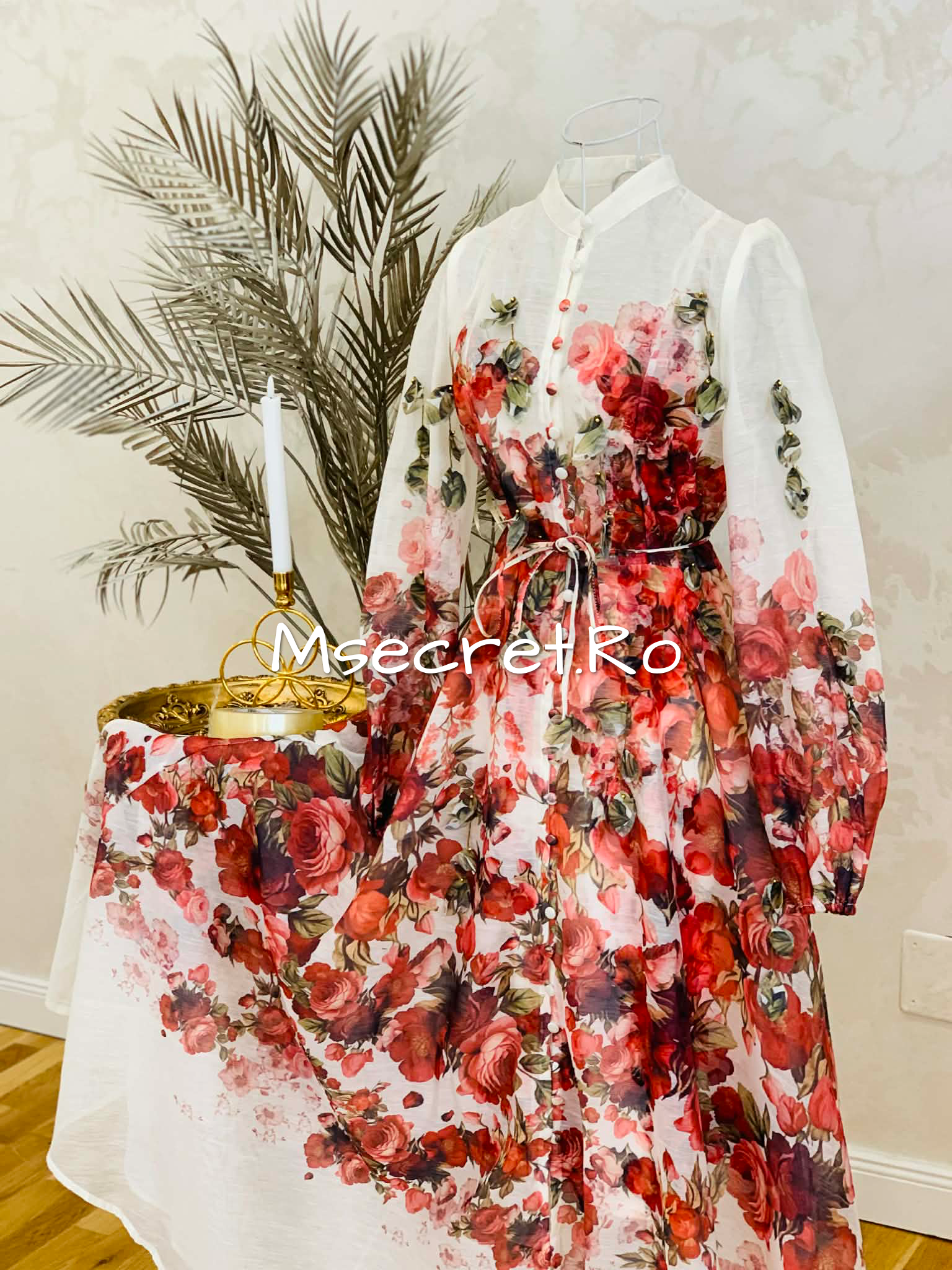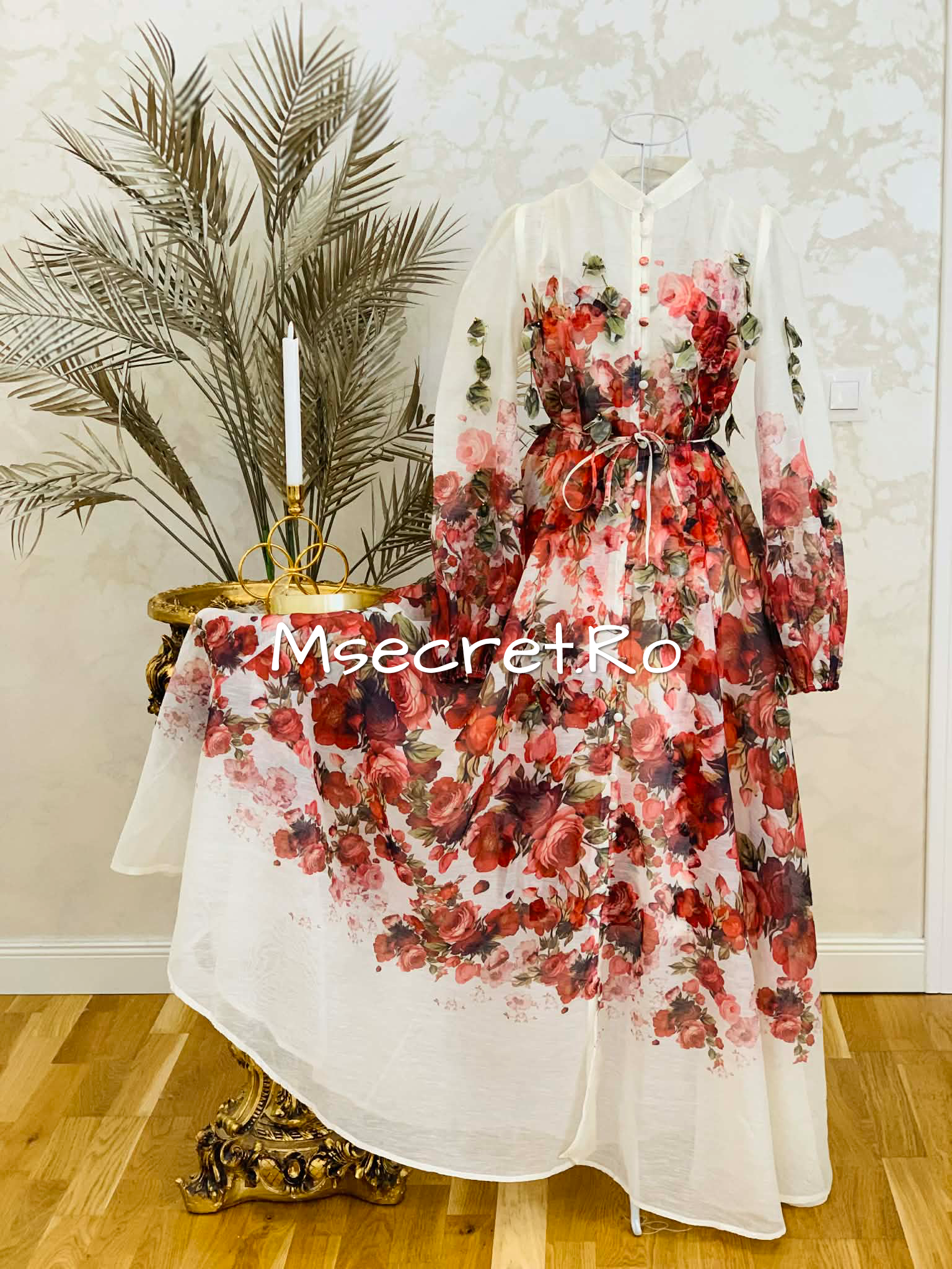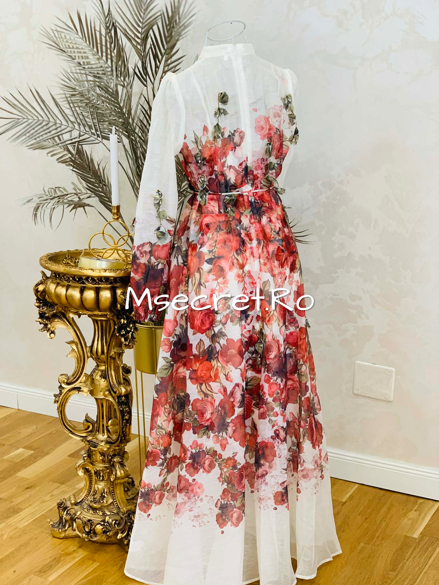 Rochie lungă din in cu imprimeu floral și aplicații 3D