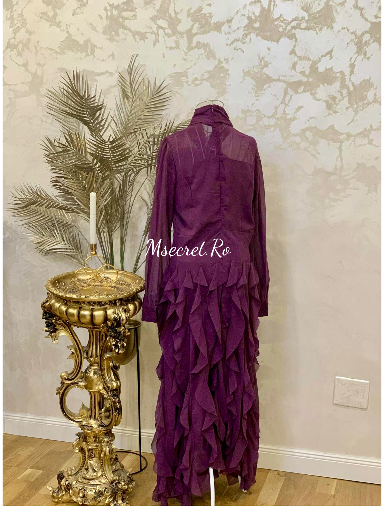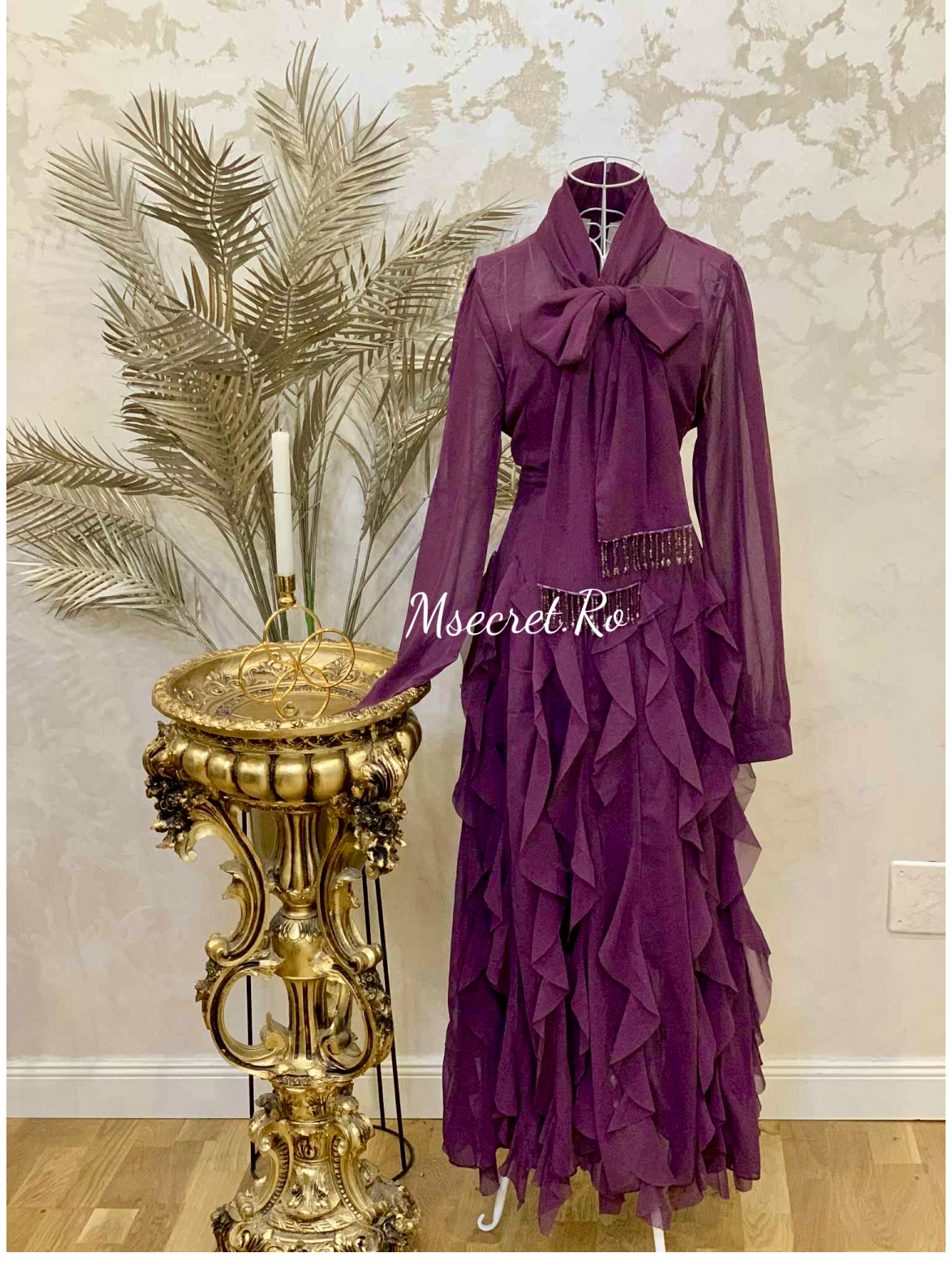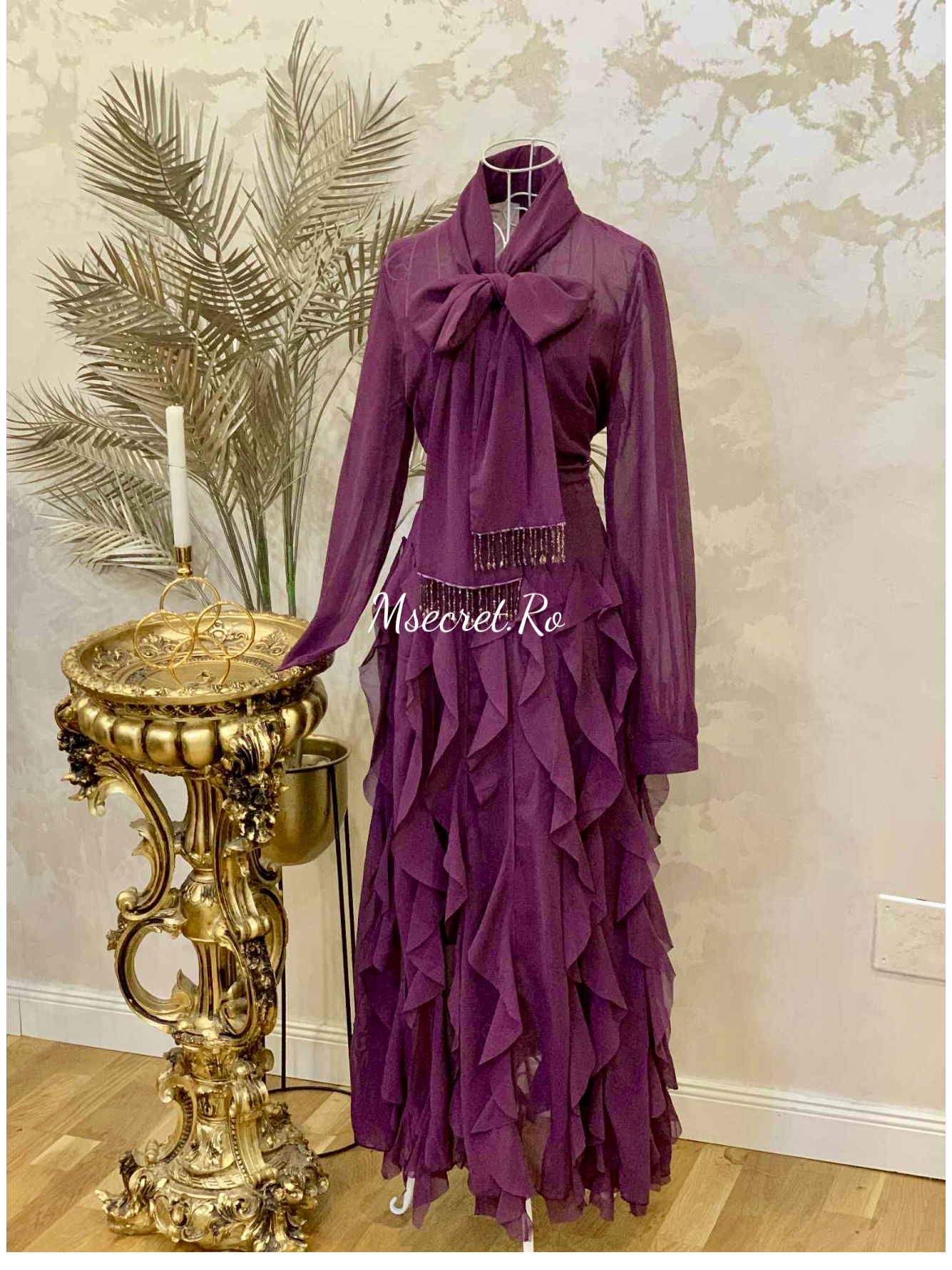 Rochie lungă spectaculoasă din voal fin, într-o nuanță intensă de mov imperial. Bustul este pus în valoare de o fundă elegantă la gât, completată de detalii cu franjuri strălucitoare. Fusta amplă, cu volane fluide în cascade, creează un efect romantic și rafinat.