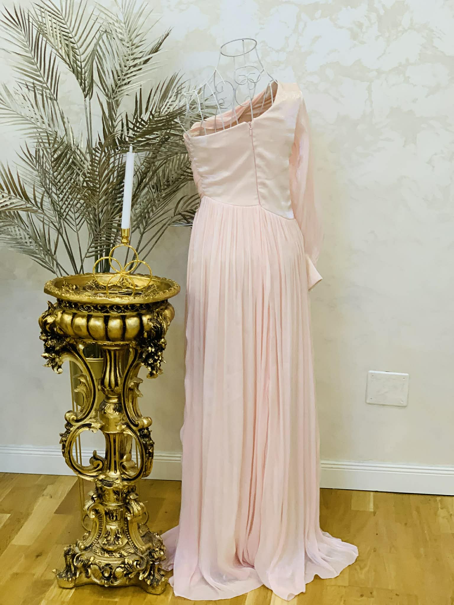 Descoperă eleganța absolută cu această rochie lungă, realizată din voal fin plisat, perfectă pentru evenimente speciale, gală, nuntă sau bal. Designul sofisticat pe un singur umăr evidențiază delicat linia gâtului și a umerilor, oferind un aer feminin și rafinat.