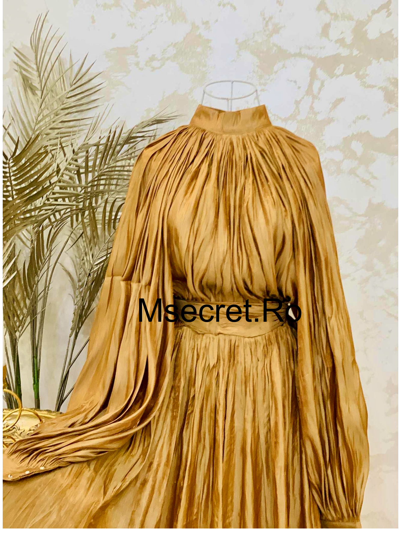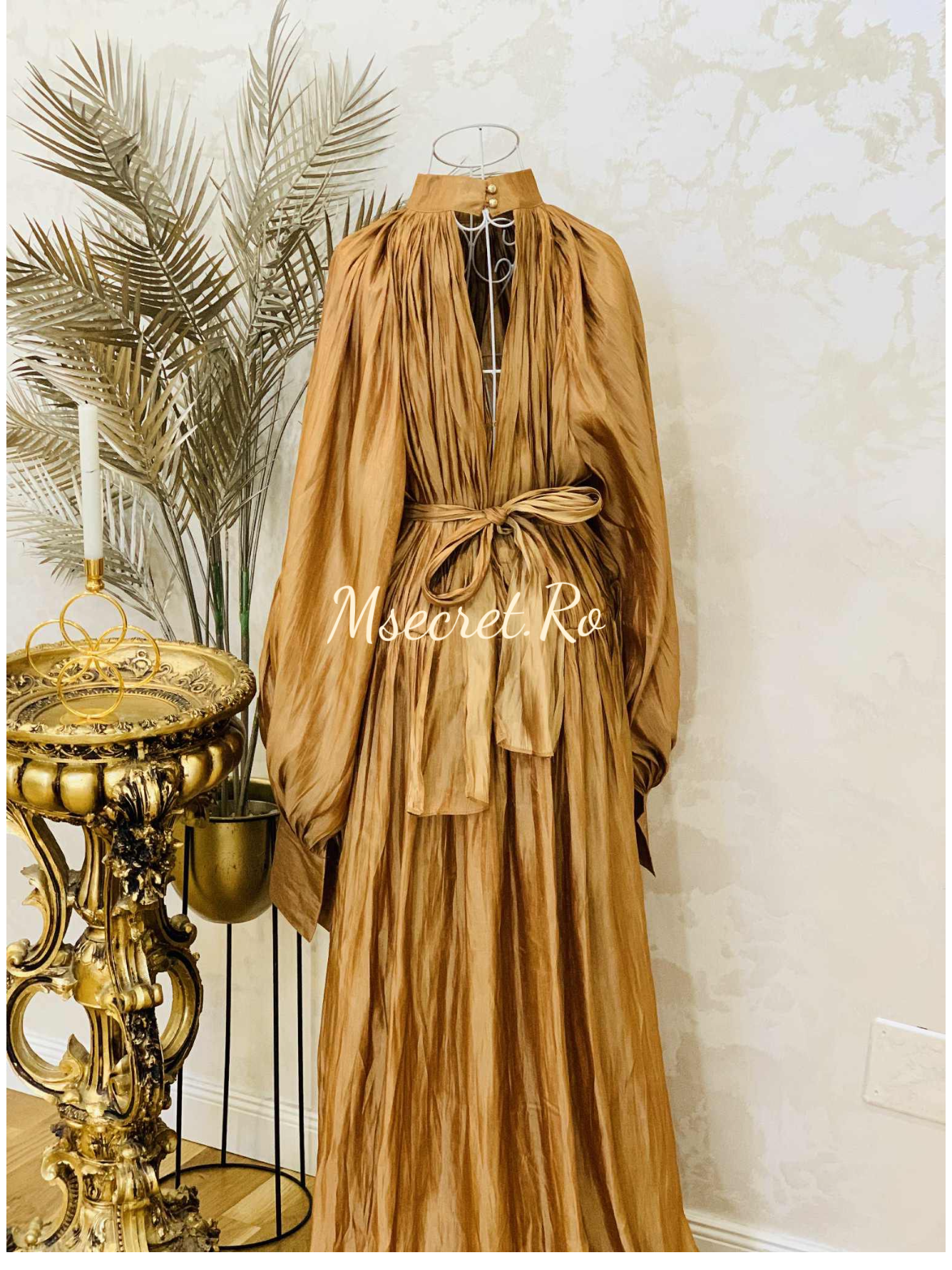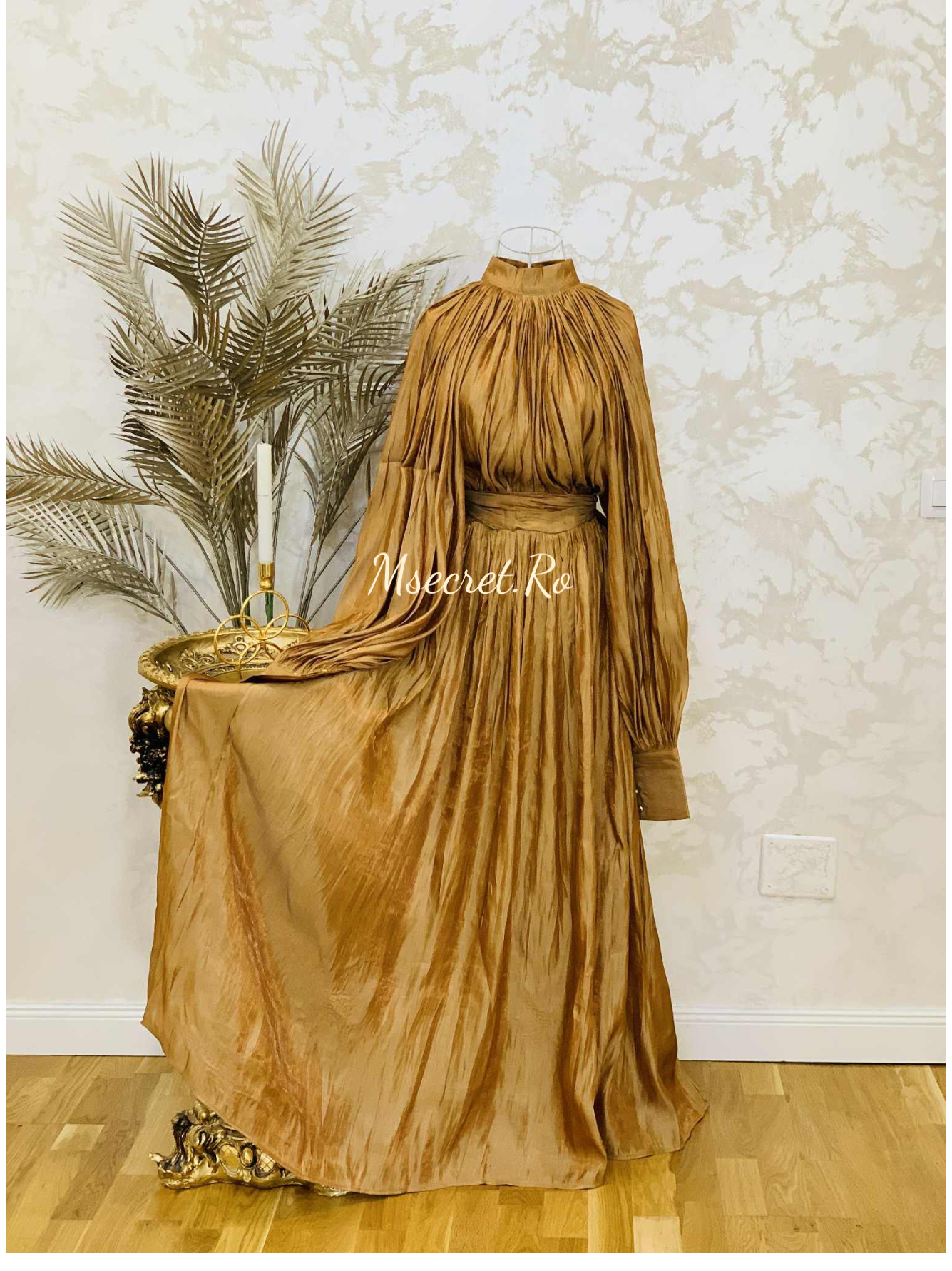 Rochie lunga satinat cu guler înalt și mâneci ample