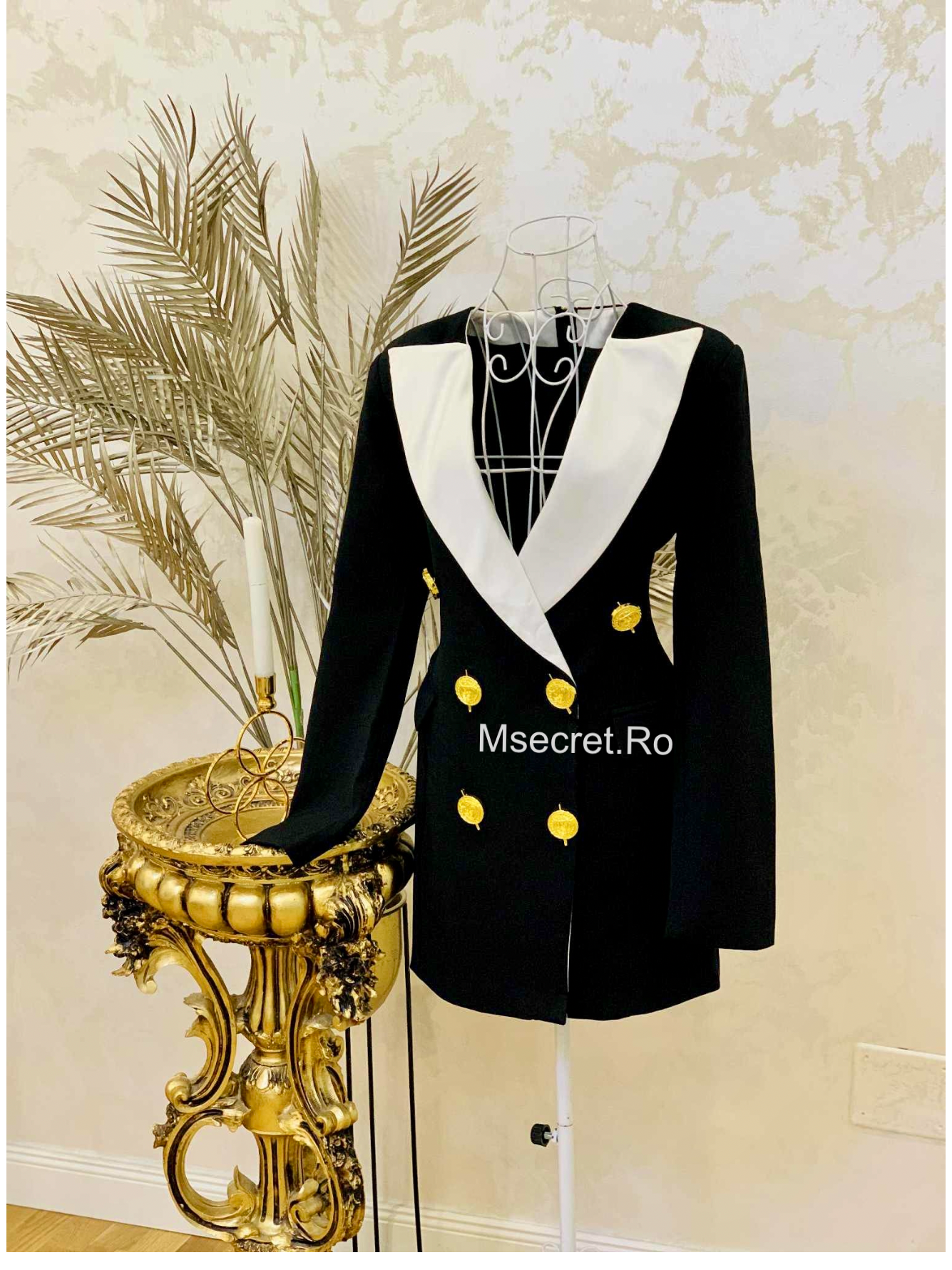 Rochie tip sacou, elegantă și rafinată, ce îmbină perfect stilul clasic cu accente moderne. Realizată din stofă fină, are o croială cambrată care evidențiază talia și o lungime scurtă ce conferă un aer feminin și îndrăzneț. Reverul alb amplu contrastează spectaculos cu fondul negru, iar nasturii aurii adaugă o notă luxoasă, inspirată din stilul couture.