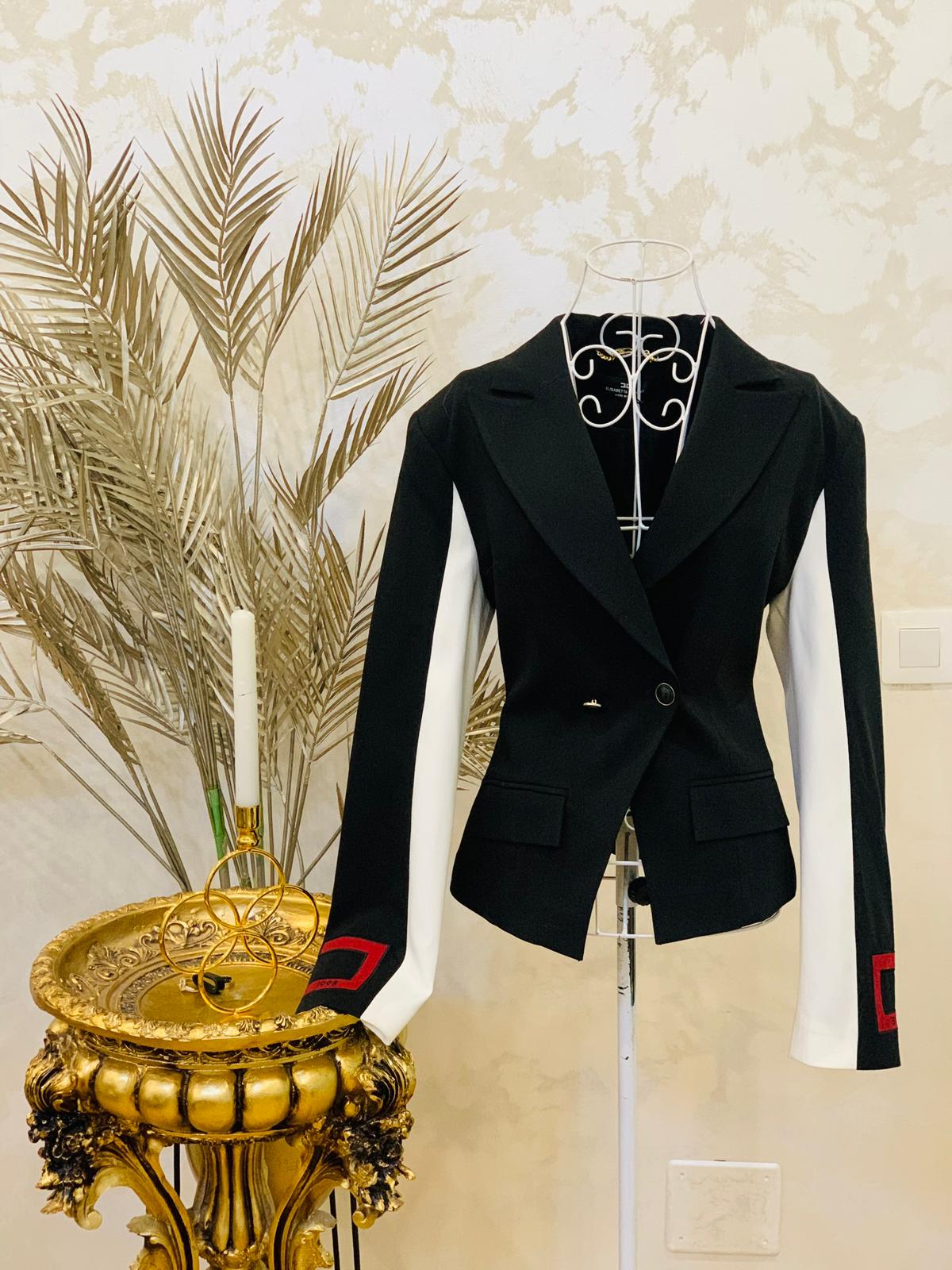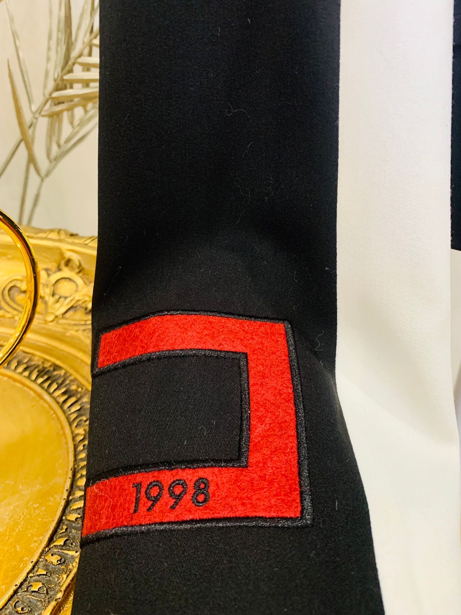 Sacou statement, cu un design modern și îndrăzneț, ideal pentru femeile care vor să iasă în evidență prin stil și rafinament. Modelul prezintă o croială cambrată, care subliniază frumos talia, și se remarcă prin mânecile bicolore alb–negru, ce adaugă un contrast sofisticat. Detaliul brodat în roșu „1998” de pe manșete oferă o notă premium și exclusivistă.
