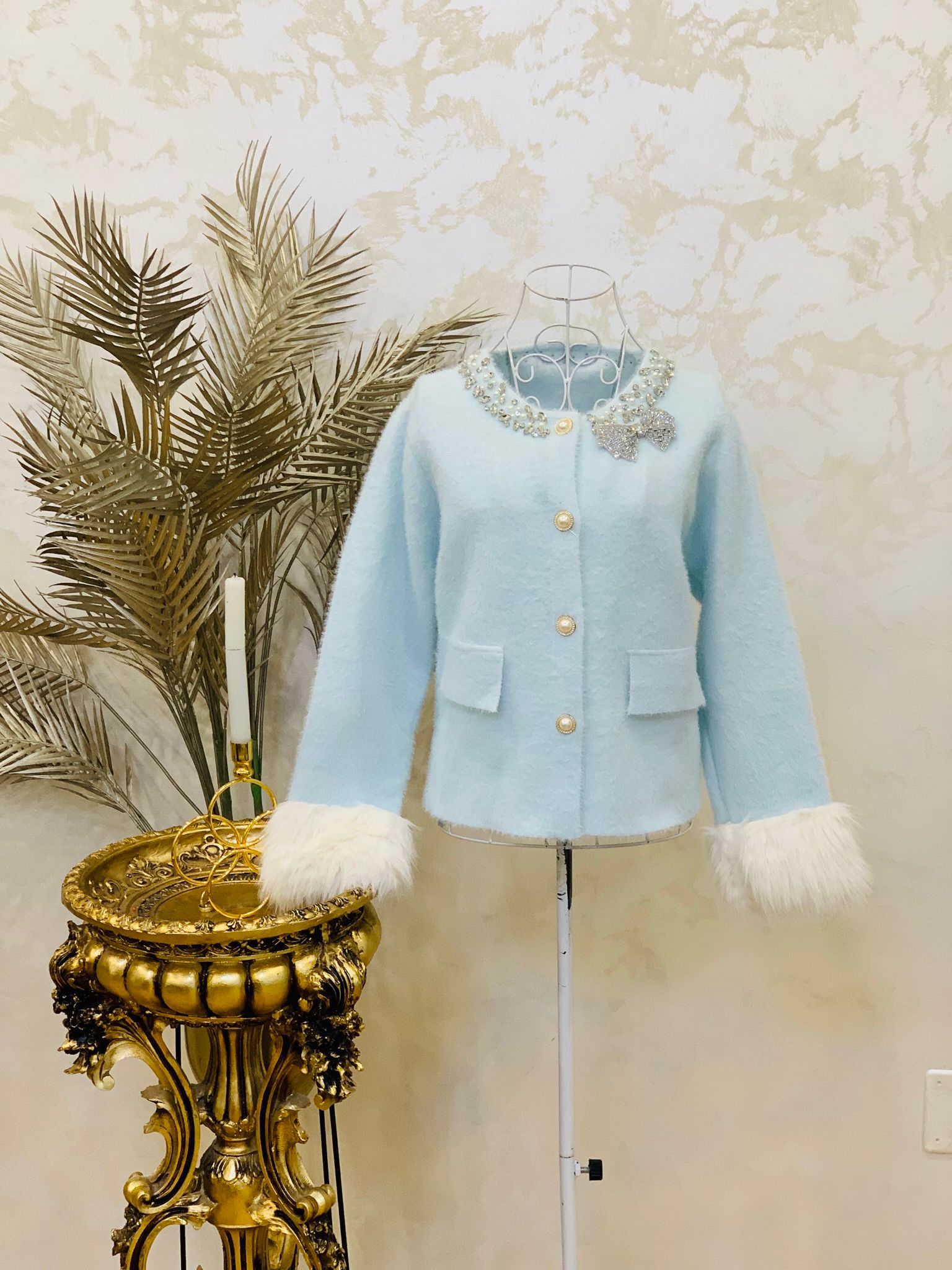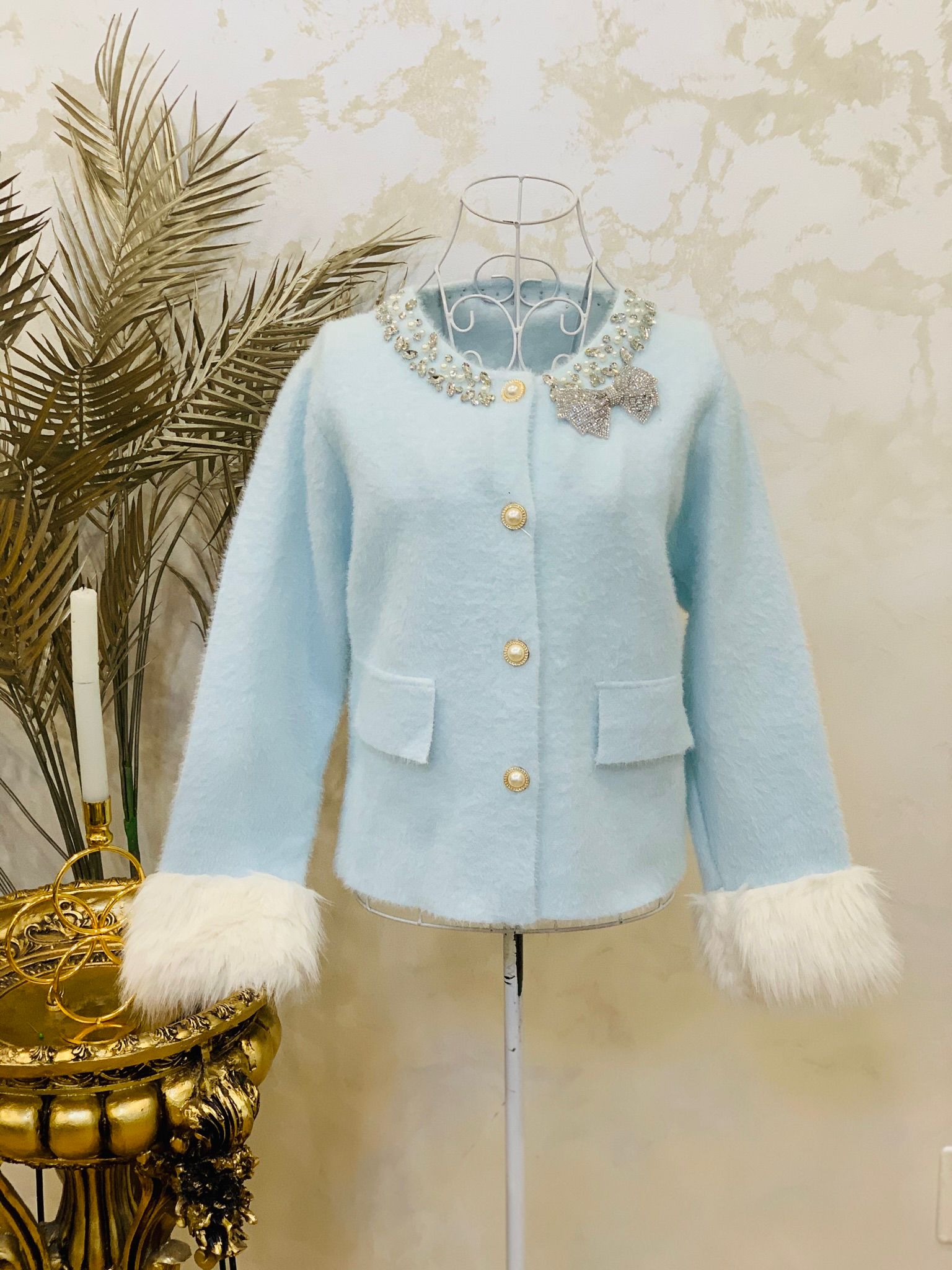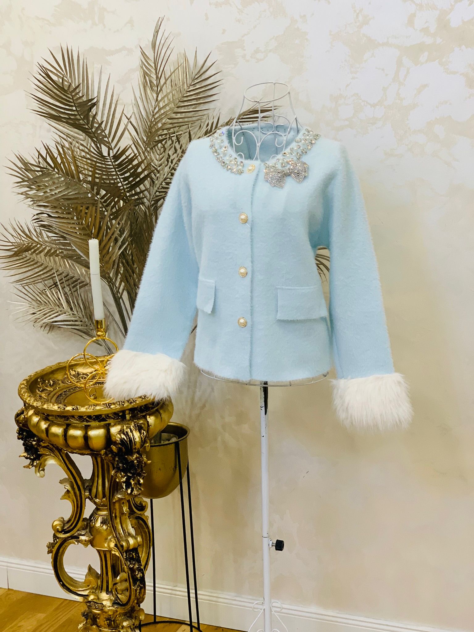 Sacou elegant, realizat din material moale și calduros, cu detalii rafinate. Gulerul decorat cu perle și fundiță strălucitoare adaugă o notă de feminitate și rafinament, iar manșetele din blană conferă un aer sofisticat
