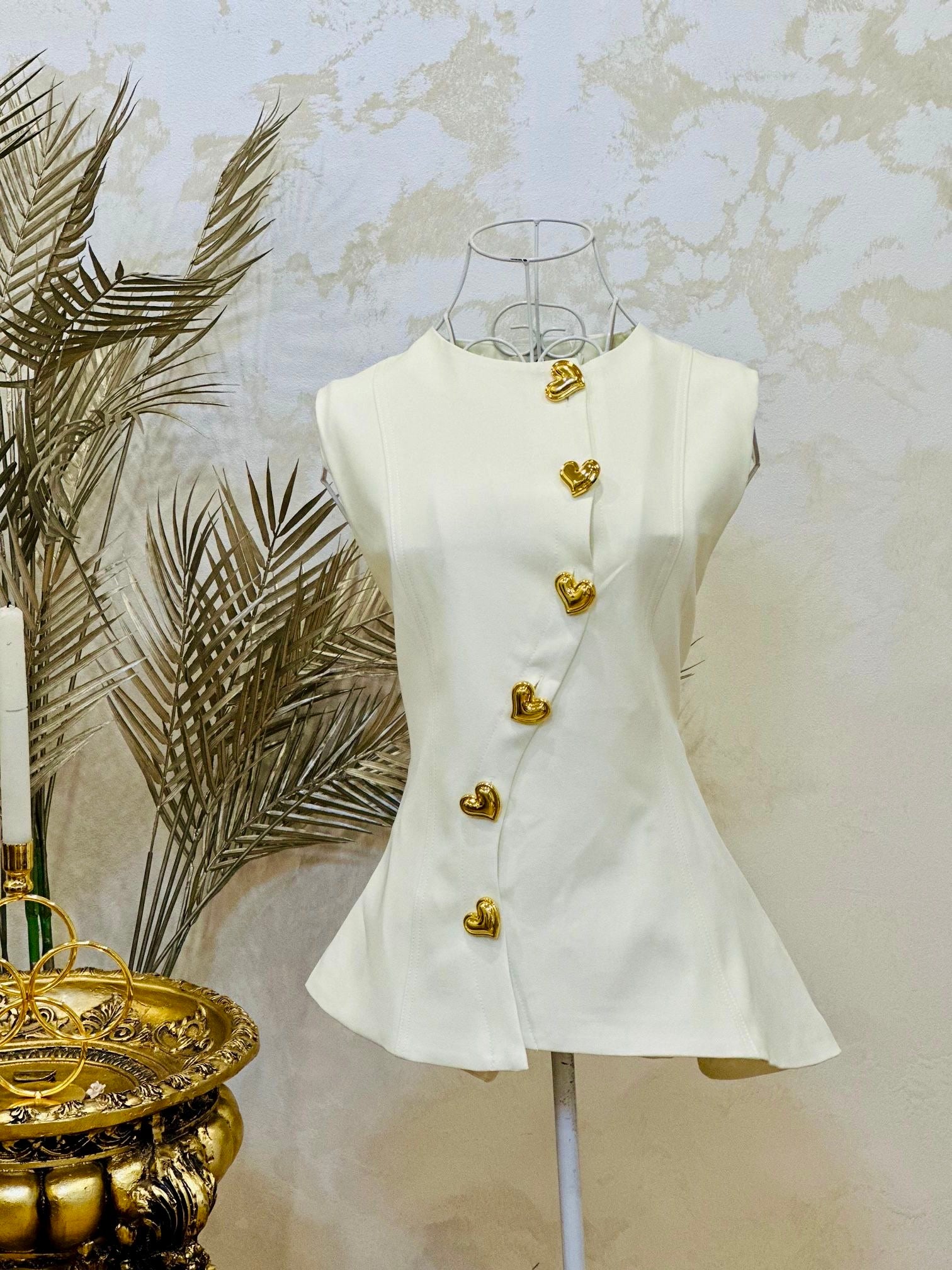- Închidere frontală asimetrică cu nasturi aurii în formă de inimă